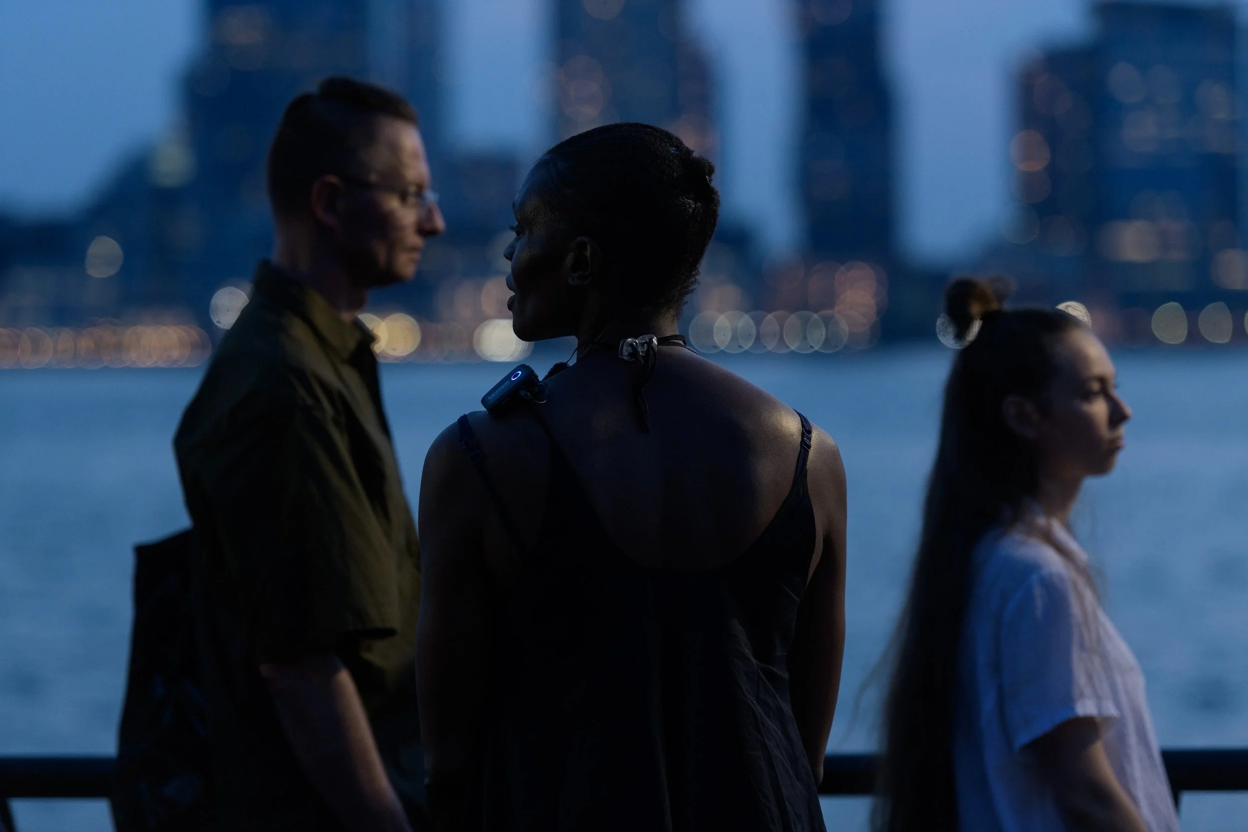 Okwui Okpokwasili and Emilý Æyer in procession. Battery Park City as part of the 2021 River to River Festival, New York, NY. photo by Ian Douglas, 2021.