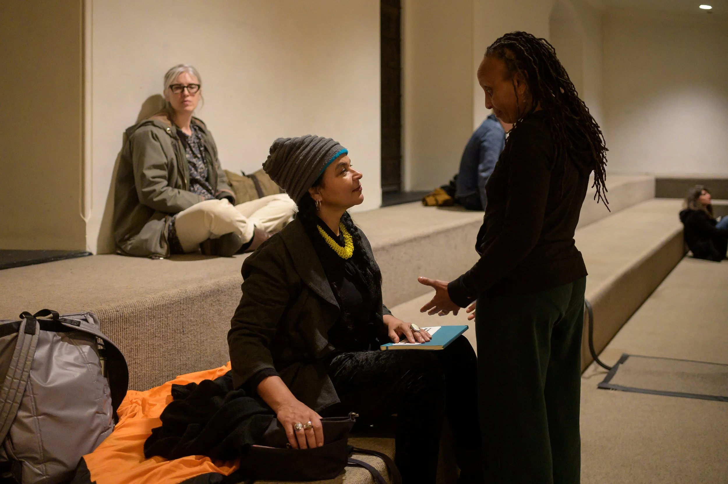 Okwui Okpokwasili and Katrina Reid in poor people’s tv room. Walker Art Center, Minneapolis, MN. 2017.